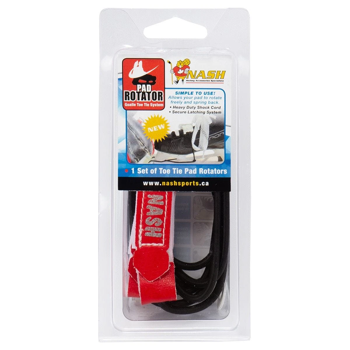 Simple to use! Toe tie system that allows your goalie pads to rotate freely and springback. Has heavy duty shock cord latching system. Works with toe assemblies with holes for lace.