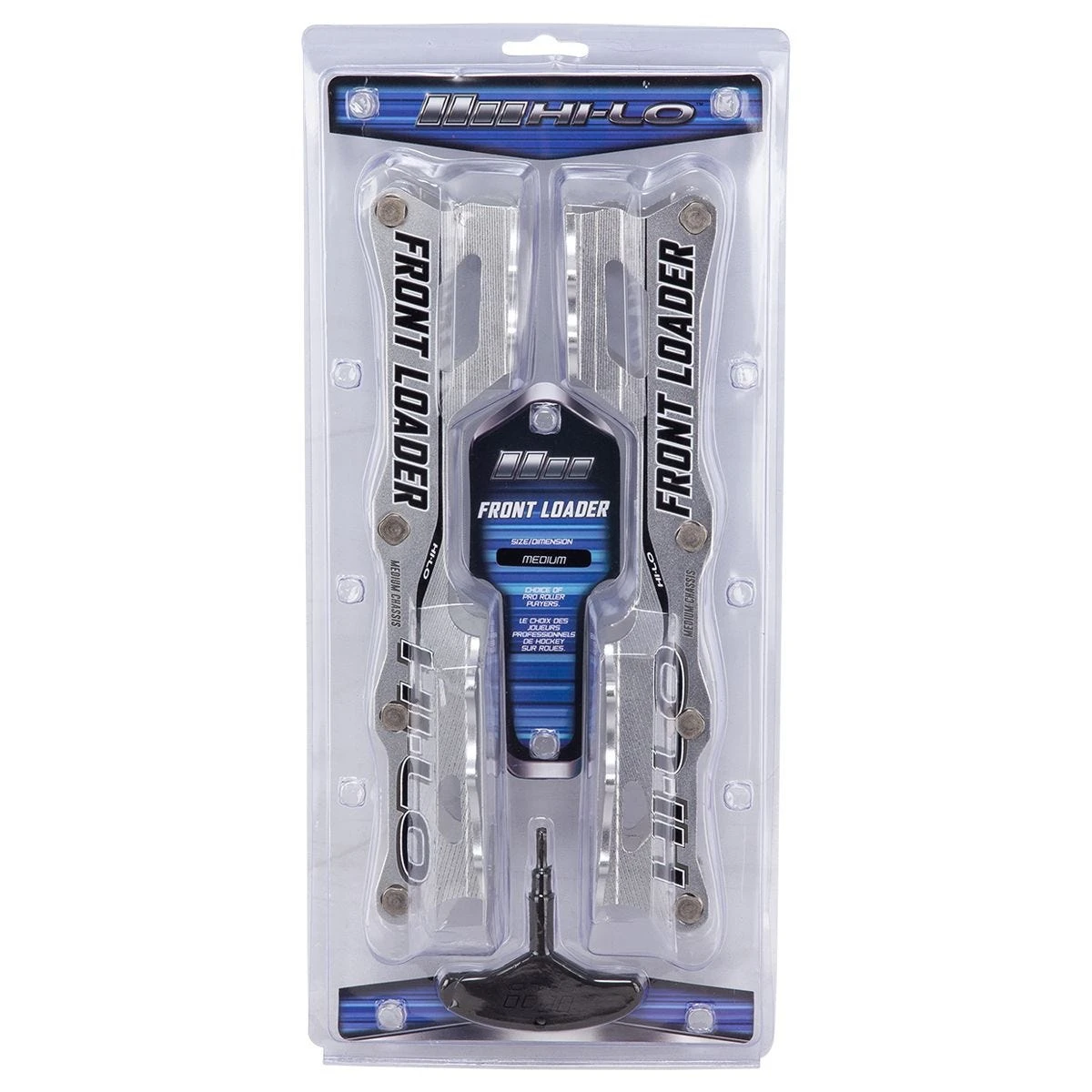 Starting off with what comes in the Bauer Hi-Lo Front loader Roller Hockey Goalie Chassis pack, this pack will come with the Front loader chassis, eight axels for wheels and a Hi-Lo skate tool that is compatible with the provided axels. Moving on to the build of the Bauer Hi-Lo Front loader Goalie Chassis, the front loader design provides the front of the chassis with more support on the toe portion of the skate to increase the lifespan of the wheels while providing a balanced feel when in a ready stance.