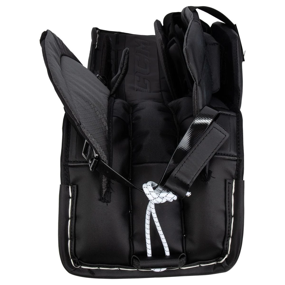 Flipping around to the inner edge, CCM has raised the inside edge with a Dual Density molded construction to create a better seal with the ice for more efficient cross-crease movements. Further back to the leg channel, an all new leg channel design adds more durability and design option through the middle of the pad. Returning for the strapping is CCM’s calf elastic strap that promotes a responsive connection between the goaltender and their pad that can be adjusted quickly. This strap sits across the back of the leg than connects via Velcro on the outside calf wrap.